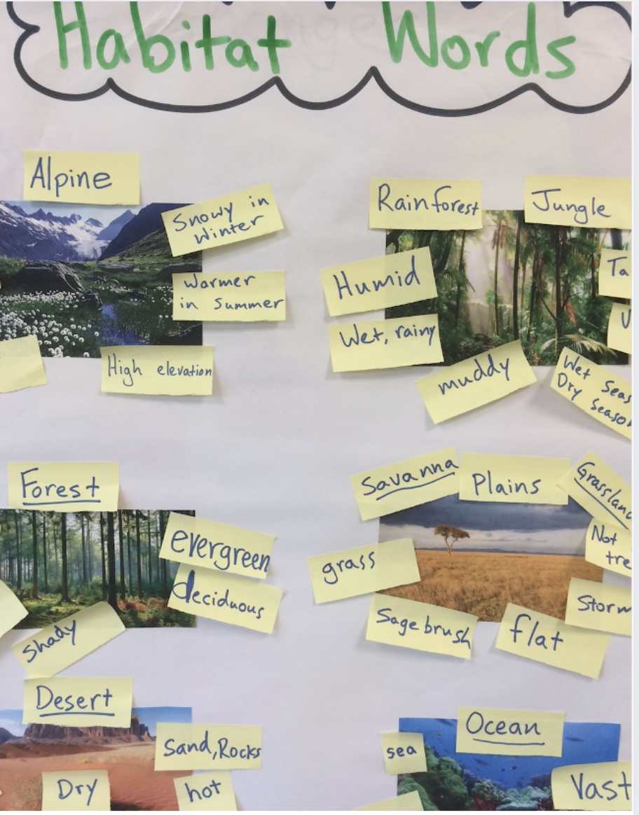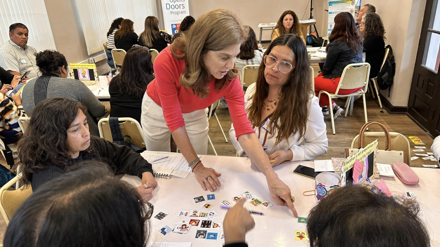Kindergarten English Language learners reference the character trait word wall as they play Go Fish to review previously taught target vocabulary.
